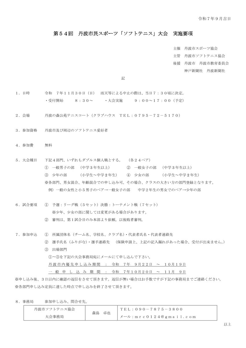 ■開催日 及び 開催場所 ⇒実施要項印刷(PDF)![]() 11月30日(日) 丹波の森公苑テニスコート ![]() |