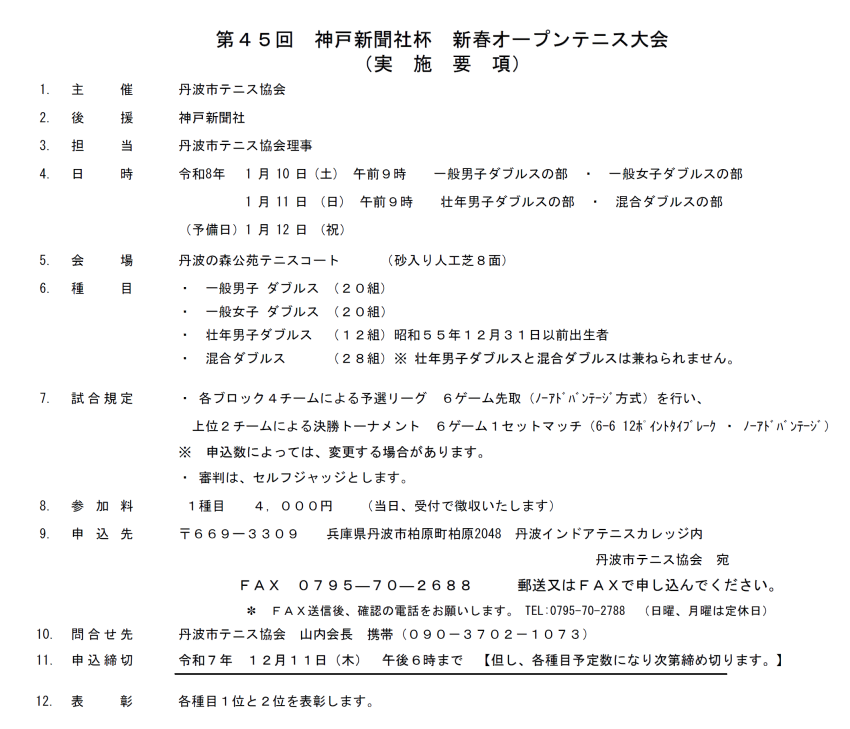 | 🎍新春オープンテニス大会🎍 ■開催日 及び 開催場所 令和8年1月10日(土)、11日(日)丹波の森公苑テニスコート (申込締切12月11日) ⇒開催要項印刷(PDF) ⇒申込書印刷(PDF) ![]() |